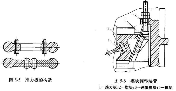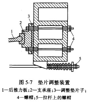 (2)墊片調(diào)整裝置。如圖5-7所示,在后推力板1的支承座2后面放入一組厚度相同的墊片3,改變墊片的數(shù)量,即可達(dá)到調(diào)整徘礦口大小的目的。在調(diào)整排礦口時,要先特螺帽4及拉桿彈簧螺帽5松開,然后增加或減少墊片的數(shù)目,待排礦口調(diào)整好后,再將螺帽4上緊,并調(diào)整彈簧上的螺帽5。用此法可以達(dá)到多級調(diào)整,調(diào)整時也比較方便,同時可以使機器結(jié)構(gòu)緊湊和質(zhì)量減小。但調(diào)整時必須停車。這種方法常用在大、中型碎礦機上。