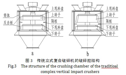 目前大多立式復(fù)合破碎機(jī)的破碎腔結(jié)構(gòu)有兩種如圖3所示:a為上、下轉(zhuǎn)子圓柱形,b為上錐形、下圓柱形轉(zhuǎn)子,上、下轉(zhuǎn)子間的環(huán)形隔板或篦板將破碎腔分上、下兩部分,上下轉(zhuǎn)子圓周均布有錘頭,旋轉(zhuǎn)的轉(zhuǎn)子錘頭與反擊板之間形成環(huán)形間隙,且由上至下的間隙是由大到小,一般情況下,上部為中碎破碎腔,下部為細(xì)碎破碎腔。[2]、[3]