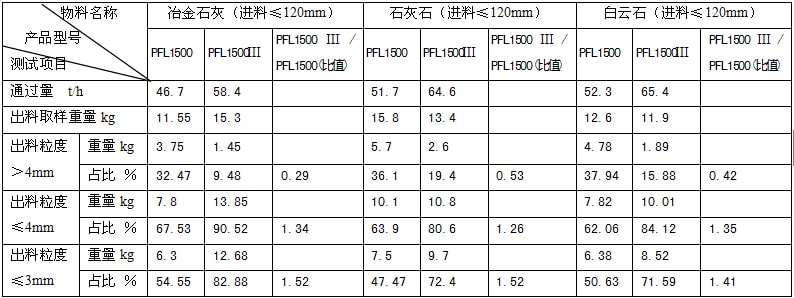 我們針對PFL老型和PFL-Ⅲ新型立式復(fù)合破碎機(jī),通過現(xiàn)場多家用戶應(yīng)用,對冶金石灰、白云石、石灰石三種物料進(jìn)行大量測試,測試結(jié)果如表2(以PFL-1500和PFL-1500Ⅲ型為例):