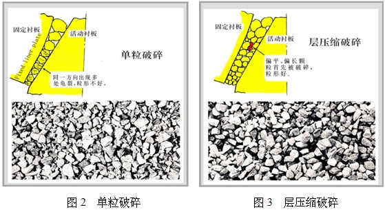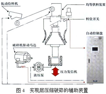 一般型號(hào)的設(shè)備為了得到較小的產(chǎn)品得把排料口調(diào)整得較小或利用特殊形狀的腔形,此種破碎是一個(gè)個(gè)的單粒直接壓縮的破碎方式,其結(jié)果是破碎機(jī)能力不能充分發(fā)揮,另外也因原料的負(fù)荷變動(dòng)、水分等影響性能受明顯影響,造成通過量小,細(xì)粒的生產(chǎn)量也小,偏平偏長(zhǎng)的產(chǎn)品多粒形不好(圖2),產(chǎn)品強(qiáng)度低,機(jī)械負(fù)荷大,機(jī)械的耐久性不好,有時(shí)不能平穩(wěn)運(yùn)轉(zhuǎn)。為了從根本上解決問題,破碎機(jī)改變了細(xì)碎的概念:加大排料口間隙,即使出口間隙大,只要滿足適當(dāng)壓縮的做功條件,就有可能生產(chǎn)出更多的細(xì)粒產(chǎn)品。實(shí)現(xiàn)層壓縮破碎的設(shè)備出口間隙大并利用特殊的破碎腔形成復(fù)數(shù)的粒子層、提高破碎腔內(nèi)的巖石密度、將破碎能量充分加給巖石,以達(dá)到破碎的目的(圖3)。為了實(shí)現(xiàn)層壓縮破碎,均勻布料裝置不可缺少,以防止原料粒度偏析、達(dá)到穩(wěn)定運(yùn)轉(zhuǎn),破碎壁與軋臼壁磨損均一,零部件壽命長(zhǎng);為了實(shí)現(xiàn)層壓縮破碎,自動(dòng)控制系統(tǒng)也不可缺少,該系統(tǒng)隨時(shí)監(jiān)視液壓系統(tǒng)的壓力值、主電機(jī)的電流值及料位,根據(jù)負(fù)荷條件自動(dòng)調(diào)整排料口間隙,以便能在最大負(fù)荷下運(yùn)轉(zhuǎn),獲得更大的產(chǎn)量及更好的粒形(圖4)。單粒破碎一般等于排料口尺寸的產(chǎn)品產(chǎn)量約占通過量的50%,層壓縮破碎一般等于排料口尺寸的產(chǎn)品約占通過量的70-80%(圖5)。