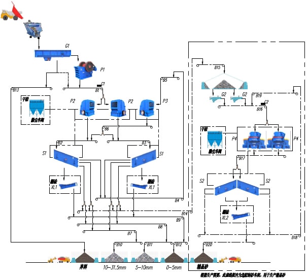 該生產(chǎn)線加工工藝主要適用于800t/h石灰石(白云巖)類中等以下硬度物料的加工破碎,將經(jīng)過爆破處理或開挖洞采的毛料通過棒條給料機(jī)均勻的供給顎式破碎機(jī)破碎,經(jīng)顎式破碎機(jī)破碎后的半成品物料通過皮帶機(jī)輸送給反擊式破碎機(jī)進(jìn)行二次破碎,經(jīng)反擊破二次破碎后的混合骨料經(jīng)過皮帶機(jī)輸送至一篩車間進(jìn)行分級(jí)篩分,篩分過后將大于用戶需要的大顆粒物料通過皮帶機(jī)輸送至細(xì)碎反擊式破碎機(jī)再進(jìn)行破碎,破碎后的物料再通過皮帶機(jī)也輸送至一篩車間進(jìn)行篩分,篩分過后的不同顆粒級(jí)別的成品通過成品出料皮帶機(jī)輸送至成品料倉。不符合要求的大顆粒再次返回細(xì)碎反擊式破碎機(jī)進(jìn)行循環(huán)破碎。