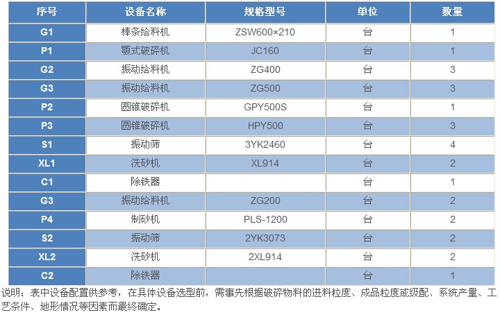 1000t/h---花崗巖(玄武巖)類巖石的砂石骨料生產(chǎn)工藝設(shè)備配置表