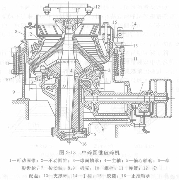 下圖為中碎圓錐破碎機的剖面圖。它的破碎作用與旋回破碎機基本相同,也是用可動圓錐1與不動錐體2之間的工作面來進行碎礦的。動錐體支撐在球面軸承3上,并固定在一個懸掛豎軸4(主軸)上,豎軸置于偏心套筒內,而偏心套筒又置于止推軸成16上。