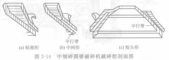 除了標準型與短頭型圓錐破碎機外,還有介于它們兩者之間的一種名為中型圓錐破碎機.既可用于中碎也可以用于細碎。標準、中型、短頭圓錐破碎機的主要區(qū)則是破碎腔的斷面形狀水同。因此,給礦粒度和排礦粒度也不同。下圖表示了這三種破碎腔剖面圖。