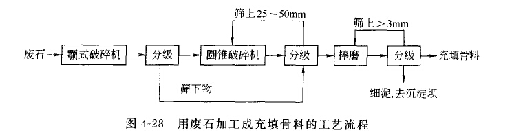 礦山開采過程中剝離及掘進時產(chǎn)生的無工業(yè)價值的礦床圍巖及夾石成為廢石。廢石的排放量很大,目前我國度石主要用于生產(chǎn)建筑材 料和辦并充填料。無論是作為建筑材料還是作為礦井充填料,都必須將廢石破碎到一定的粒度,以滿足不同用途的要求。圖4—28 所示為以破碎廢石作為井下膠結(jié)充填月料的工藝流程。