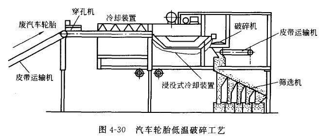 圖4—30所示為汽車輪胎低溫破碎上藝。經(jīng)皮帶運輸機送來的廢輪胎采用穿孔機穿孔后,經(jīng)噴灑式冷卻裝置預(yù)冷,再送涅沒式冷 卻裝置冷卻。通過輥式破碎機破碎分離成“橡膠和夾絲布”與“車輪兇緣”兩部分,然后送至安合磁選機的皮帶 運輸機進行磁選。前者經(jīng)錘碎機二次破碎后送篩選機分離成不同粒度至再生利用工序。