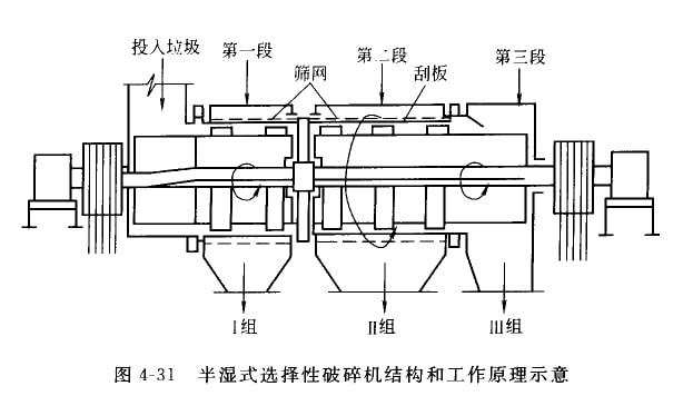 半濕式選擇性破碎機是把破碎機械和篩分機械構(gòu)成 體同時進行破碎、分選兩個過程的一種機械裝置。它由兩種具有不同孔眼 篩網(wǎng)的間轉(zhuǎn)滾筒組成,滾筒內(nèi)勺第一篩網(wǎng)和第二篩網(wǎng)分別對應(yīng)安裝有不同轉(zhuǎn)速的利板。分選裝置分為三段,第一、二兩段裝設(shè)篩網(wǎng),第 三段不設(shè)篩網(wǎng)。
