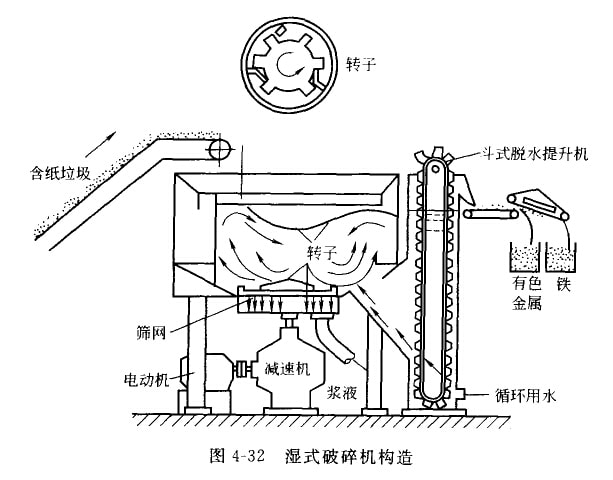 濕式破碎是利用特制的破碎機將投入機內(nèi)的含紙垃圾和大量水流一起劇烈攪拌和破碎成為漿液的過程,從間pJ以四收垃圾中的紙纖維 。這種使合紙垃圾漿液化的特制破砷機稱為濕式破碎機。濕式破碎技術(shù)是為回收城市坊圾巾的大量紙類為日的而發(fā)展起來的,美國 Franklin市和日本東京都已經(jīng)安裝了濕式破碎機,從城市垃圾中回收紙漿。