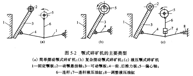 顎式碎礦機(jī)的類型很多,目前在我國(guó)選礦廠中使用最廣的主要有簡(jiǎn)單擺動(dòng)顎式碎礦機(jī)(如圖5-2a)和復(fù)雜擺動(dòng)顆式碎礦機(jī)(如圖5-2b)兩種類型。近年來,由于液壓技術(shù)的應(yīng)用,在簡(jiǎn)單擺動(dòng)顎式碎礦機(jī)的基礎(chǔ)上制成了液壓顎式破碎機(jī),如圖5-2c所示,在選礦廠也開始應(yīng)用。