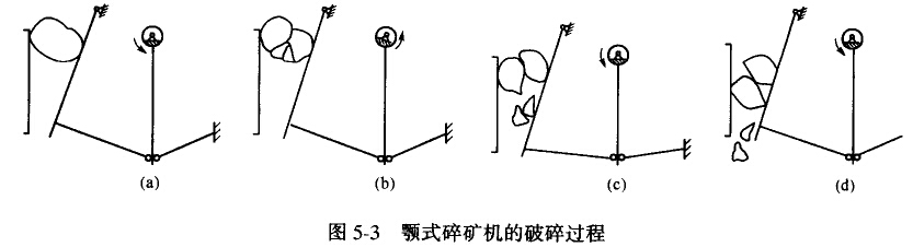 圖5-3為一大塊物料在顎式碎礦機(jī)中被破碎的過程。因5-3a是動(dòng)顎板張到最大的位置,即動(dòng)顎離固定顎最遠(yuǎn),此時(shí)鉤料進(jìn)入破碎腔。圖5-3b是動(dòng)顎逐漸向固定顎靠近,物料受擠壓,劈裂和折斷的作用產(chǎn)生裂縫而被破碎。圖5-3c是動(dòng)顎靠近固定顎最近的位置,被破碎的物料分為幾個(gè)小塊。圖5-3d是動(dòng)顎又張到最大位置,被破碎了的物料由于自重下落而從排礦口排出,大于排礦口的則落至下部與新給入的物料再次受到破碎。
