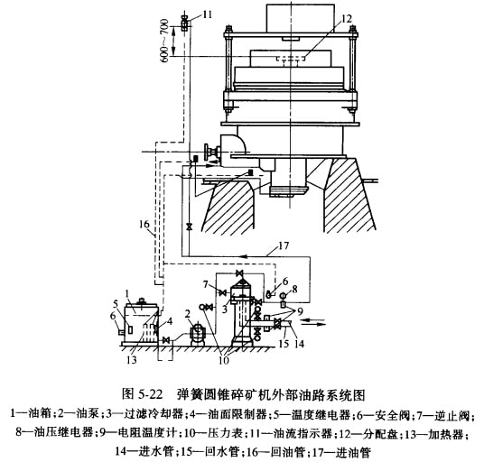 碎礦機的潤滑,是采用循環(huán)液體油集中潤滑,油通過油泵從機架下中心套簡14側(cè)壁上的油孔進(jìn)入偏心軸套的止推團(tuán)盤中。由于圓盤上有放射狀油溝,故圓盤得以潤滑,然后由此處分為三路上升。一路沿青銅襯套與偏心軸套間的間隙上升嚴(yán)路從偏心軸套與主袖間的間隙上升;一路沿主軸的中心圓孔上升,流至動錐底部球面與球面青銅軸瓦問的間隙中。并潤滑這些摩擦面。然后這三路油匯合在一起,流經(jīng)大小傘齒輪并潤滑之。最后順流而下至排油管排出,流回原油箱中。潤滑汕不僅起到潤滑作用,而且?guī)ё吡烁髂Σ撩娈a(chǎn)生的熱量,所以在油流回油箱前要經(jīng)過冷卻裝置,使油冷卻后再回至油箱中。水平傳動軸與軸承的潤滑是單獨的油路系統(tǒng)。調(diào)整環(huán)和支撐環(huán)上的梯形調(diào)整螺紋,是從支撐環(huán)側(cè)壁上的注油孔向螺紋注入黃干油來潤滑的。圖5-22是彈簧圓錐碎礦機外部油路系統(tǒng)圖。