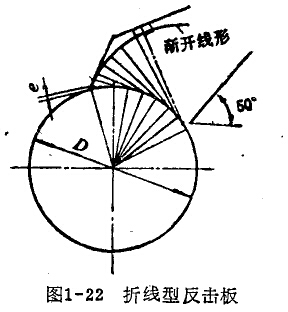 反擊板是反擊式破碎機(jī)的主要部件。反擊扳的型式有折線型和弧線型兩類。漸開線型反擊板(圖1-22)的主要特點(diǎn)是:物料以垂直于反擊板的方向沖擊到反擊板上,因此可獲得最佳的破碎效果。但是由于漸開線型反擊面制作困難,而且實(shí)際破碎時(shí),由于料塊在腔內(nèi)相互間的干擾,其運(yùn)行軌跡已不規(guī)則,故通常采用近似漸開綏的折線型反擊板代之。