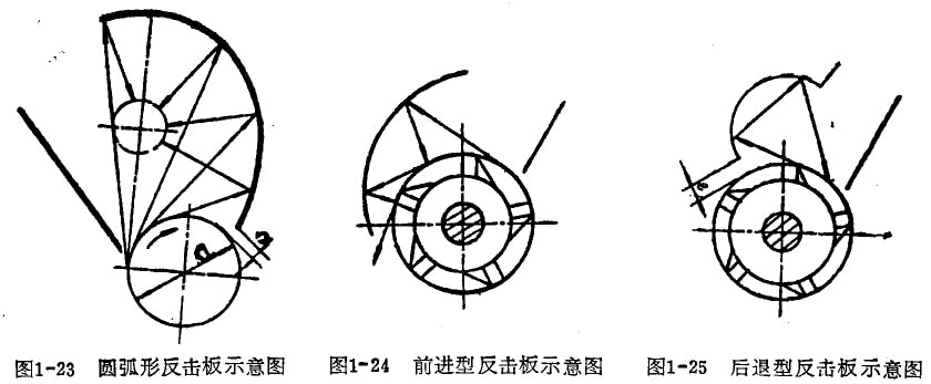 圖1-25所示為后退型的反擊板。物料的反彈軌跡朝加料端后退回到?jīng)_擊點(diǎn),這樣可增加物料承受沖擊的次辦獲得較細(xì)粒級(jí)的產(chǎn)品。