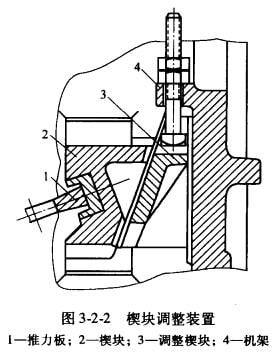 (2)楔塊調(diào)整。借助后推力板支座與機(jī)架后壁之間的兩個(gè)楔塊的相對移動來實(shí)現(xiàn)破碎機(jī)排礦口的調(diào)整(圖3-2-2)。轉(zhuǎn)動螺栓上的螺帽,使調(diào)整楔塊3沿著機(jī)架4的后壁做上升或下降移動,帶動前楔塊2向前或向后移動;從而推動報(bào)力板或動領(lǐng),以達(dá)到排礦口調(diào)整的目的。此法可以達(dá)到無級調(diào)整,調(diào)整方便,節(jié)省時(shí)間,不必停車調(diào)整,但增加了機(jī)器的尺寸和質(zhì)量。中、小型額式破碎機(jī)常常采用這種調(diào)整裝置。