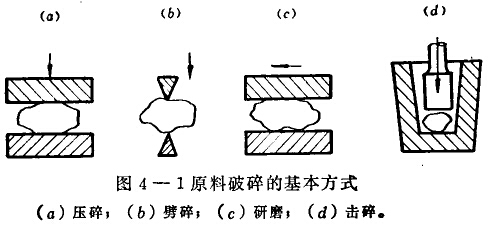 為了衡量原料在破碎前后粒度變化的程度和均衡分配備個破碎階段的工作量,常引用破碎比這一概念來表示原料的破碎過程。破碎比是原料在破碎前的最大粒度與破碎后的最大粒度之比值。破碎比取決于破碎機(jī)械的類型和構(gòu)造,也與送入破碎機(jī)的料塊大小有關(guān)。一般預(yù)碎階段的破碎比為2-10,中碎階段為2-8,細(xì)碎階段為10-20。不同破碎機(jī)械的破碎比不同,其破碎方式也不同,根據(jù)破碎機(jī)給予料塊的破碎力,原料的破碎方式大體可分為四種:壓碎、劈碎、研磨和擊碎,如圖4-1所示。