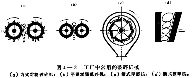 在工廠中常用的破碎機(jī)有;齒式對輥破碎機(jī),如圖4-2(a),兩個表面帶齒的輥?zhàn)酉鄬D(zhuǎn)動,牙齒不斷作用于料塊上,使料塊破碎;平輥對輥破碎機(jī),如圖4-2(b),兩個相對旋轉(zhuǎn)的平滑圓輥不斷地壓在科塊上,將科塊壓碎;帶篩網(wǎng)式球磨機(jī)(篩式球磨機(jī)),如圖4-2(c),在回轉(zhuǎn)的筒體內(nèi)借鋼球的撞擊力和研磨作用,使料塊破碎;顎式破碎機(jī),如圖4-2(d),通過擺動的顎板對料塊施加周期性的壓力,將料塊破碎。
