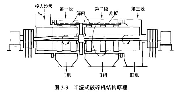 圖3—3所示為半濕式破碎機(jī)的結(jié)構(gòu)原理。該裝置由兩段具有不同尺寸篩孔的外旋轉(zhuǎn)圓筒篩和篩內(nèi)與之反方向旋轉(zhuǎn)的破碎板組成。垃圾在圓筒篩首端給入,并隨篩壁上升后又在重力作用下被拋落,拋落時(shí)受到反向旋轉(zhuǎn)的破碎板撞擊,垃圾中易脆物質(zhì)(An玻璃、陶瓷等)首先被破碎,通過(guò)第一段篩網(wǎng)分離排出。剽余垃圾進(jìn)入第二段篩網(wǎng),此段噴射水分,在水中易碎的紙類在水噴射下被破碎板破碎,由第二段篩網(wǎng)排出。最后剩余的垃圾(主要為金屬、塑料、橡膠、木材、皮革等)由不設(shè)篩網(wǎng)的第三段排出。