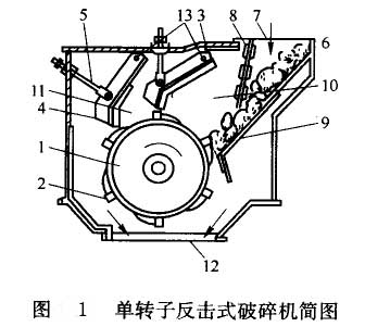 單轉(zhuǎn)子反擊式破碎機(jī)結(jié)構(gòu)見圖l。物料內(nèi)進(jìn)料口7下到破碎機(jī)體6內(nèi)。為了防止破碎后的料塊從進(jìn)料口飛出,在進(jìn)料口處裝有一排鏈條8。給入的料塊落到算條篩9上。細(xì)小的碎塊經(jīng)篩下直送排料口12,大塊的物料順?biāo)銞l落到轉(zhuǎn)于1上。轉(zhuǎn)子軸上面裝有凸起一定高度的板錘2。板錘根據(jù)轉(zhuǎn)子直徑大小有4—6排。轉(zhuǎn)子由電動(dòng)機(jī)經(jīng)過聯(lián)軸器和軸帶動(dòng)轉(zhuǎn)子轉(zhuǎn)動(dòng)。料塊就在高速旋轉(zhuǎn)的板錘和反擊板3之間來回碰撞破碎,在箅條篩、轉(zhuǎn)子l,第一反擊板3及進(jìn)料口鏈條組成的空間內(nèi)形成強(qiáng)烈的沖擊區(qū)10,物料破碎后又落到反擊板3和反擊板4以及轉(zhuǎn)子1所組成的第二沖擊區(qū)11內(nèi)近一步受到?jīng)_擊粉碎。破碎后物料經(jīng)轉(zhuǎn)子下方排料口12排出。