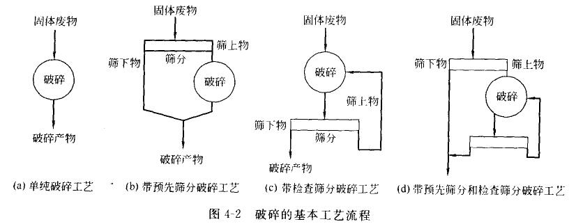根據(jù)固體廢物的性質(zhì)、顆粒的大小、要求達(dá)到的破碎比和選用的破碎機(jī)類型,每段破碎流程可以有不同的組合方式,其基本的工藝流程如圖4-2所示。