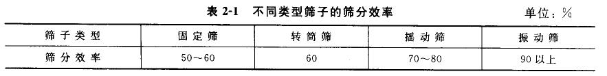 篩子運動方式對篩分效率有較大的影響,不同類型的篩分設備,其篩子運動方式不同,其篩分效率亦不同。同一種固體廢物采用不同類型的篩子進行篩分時,其篩分效率大致如表2-1所示。