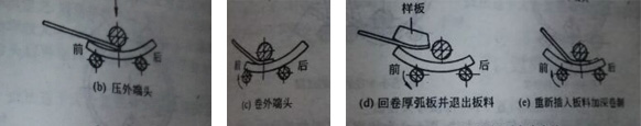 3、按箭頭方向回卷兩板,使厚弧板偏心放置(前多后少),預(yù)彎頭板脫床,并用樣板檢查曲率,若弧欠時可再次插入卷制,直至達(dá)到理想弧。(如圖d e)