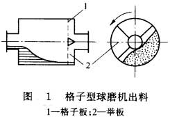 另一種球磨機(jī)是在出料端附近有格子板。格子板由若干塊扇形板組成,扇形板上有寬度為8—20mm的篩孔,物料可通過(guò)篩孔而聚集在格子板與右端蓋之間的空間內(nèi)。此空間內(nèi)有若干塊輻射狀的舉板。筒體轉(zhuǎn)動(dòng)時(shí).舉板將物料向上提舉,物料下落時(shí)經(jīng)過(guò)錐形塊而向出料端折轉(zhuǎn),經(jīng)右端中空軸排出。由于格子板和舉板的作用,物料在出料端的料位較低,使排料加快,生產(chǎn)量提高,參見圖1。