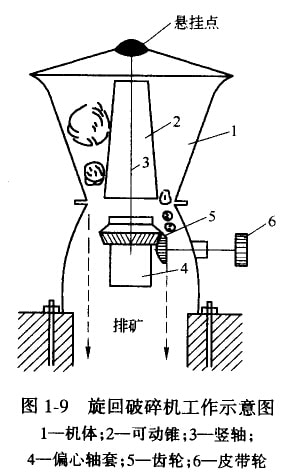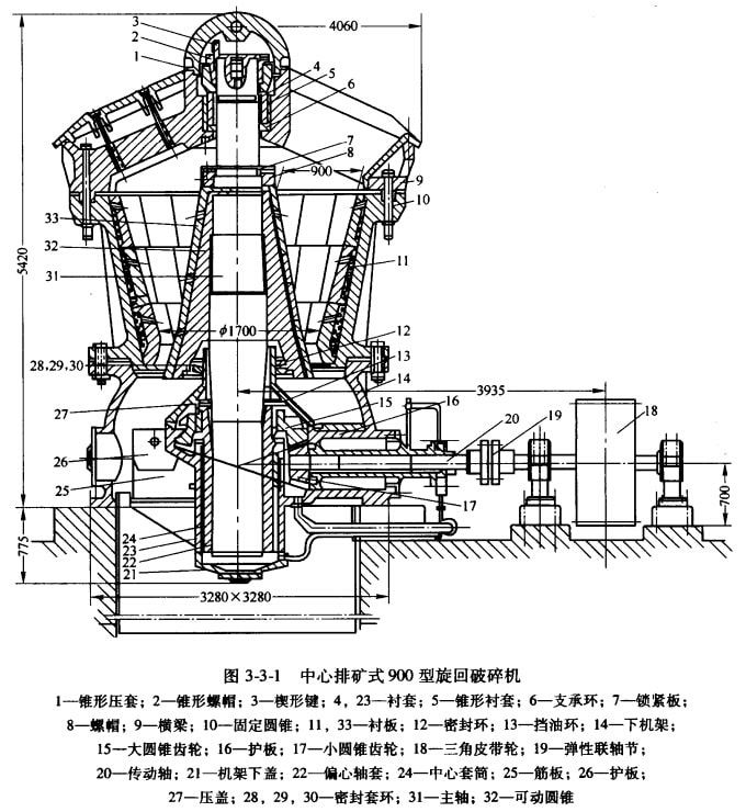 (1)中心排礦式旋回破碎機(jī):這種破碎機(jī)的構(gòu)造(圖3-3-1),主要是由工作機(jī)構(gòu)、傳動(dòng)機(jī)構(gòu)、調(diào)整裝置、保險(xiǎn)裝置和潤(rùn)滑系統(tǒng)等部分組成。