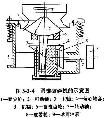 圓錐破碎機(jī),因其破碎礦石的部分,是由兩個(gè)圓錐體組成,故稱為圓錐破碎機(jī),如圖1—9所示?蓜(dòng)錐2在機(jī)體1內(nèi),其中空間為破碎腔。物料從上部給人,由于偏心軸套4的作用,使動(dòng)錐的錐體周期地靠近與離開(kāi)定錐的錐面出動(dòng)錐靠近定錐時(shí),產(chǎn)生破碎作用,離開(kāi)時(shí),已破碎的物料從破碎腔中排出。圓錐破碎機(jī)的工作原理與顎式破碎機(jī)相似,可以看成是連續(xù)作用的顎式破碎機(jī)。因?yàn)椴徽撈妮S轉(zhuǎn)到什么位置,在固定錐的表面上總有一點(diǎn)和破碎錐接近,因而在這一點(diǎn)附近,就可以進(jìn)行破碎。也正因?yàn)槿绱,圓錐破碎機(jī)可以不必使用笨重的飛輪。