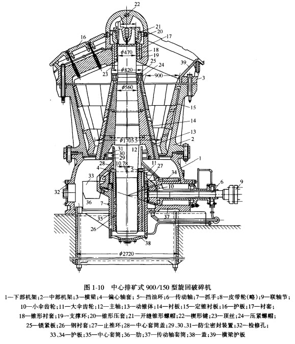 圖1—10是國產(chǎn)的900/150型中心排礦式旋回破碎機,它由機架、偏心抽套、主軸和動錐、懸掛裝置及傳動機構(gòu)等部分所組成。