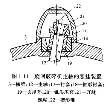 主軸12通過開縫錐形螺帽21、錐形壓套20、襯套17和支撐環(huán)19懸掛在橫梁上,并用楔形鍵22防止開縫錐形螺帽2l退扣。襯套17的錐形端支承在支撐環(huán)19上,而側(cè)面則支承在錐套18上:在破碎機運轉(zhuǎn)時,由于襯套17的下端與錐形襯套18的內(nèi)表面部是圓錐面,故能保證村套17沿支撐環(huán)19利錐形襯套18滾動.從而滿足了動錐旋擺運動的要求。