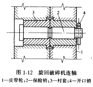 旋回破碎機的保險裝置,主要是利用連接傳動蝕和三角皮帶輪的聯(lián)細節(jié)土的保險銷,當過負荷時或破碎機中落人大塊非破碎物時(如電鏟齒),保險銷即被招斷,達到保險的日的。其裝置如圖1—12所示,它由四個保險銷組成,裝在聯(lián)軸節(jié)上,用以連接傳動軸和i角皮帶輪。