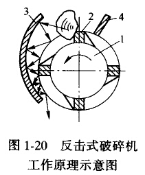 反擊式破碎機(jī)的工作部件為帶有板錘2的高速旋轉(zhuǎn)的轉(zhuǎn)子1;給人機(jī)內(nèi)的料塊在轉(zhuǎn)子回轉(zhuǎn)范圍(錘擊區(qū))內(nèi)受到板錘沖擊。物料是經(jīng)導(dǎo)板4給人錘擊區(qū)的,料塊被板錘沖擊后拋起;高速地撞在反擊板3上,再次受到?jīng)_擊,然后又從反擊板彈回板錘,繼續(xù)重復(fù)上述過程。在往返過程中,物料還互相碰撞,在沖擊、反彈、相互碰撞等作用下,物料料塊不斷產(chǎn)生裂縫、松散最后破碎,破碎的物料從機(jī)體下部卸出。參見圖1—20。