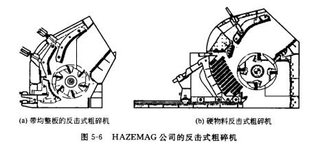 HAZEMAG公司開發(fā)了硬物料的反擊式粗碎機。這種破碎機的工作件都以耐磨性很高的高鉻合金制造,其硬度高達HRC60以上,并有一定的沖擊韌性。在結構上也注重工作金屬的充分利用。型號APPKM1615的破碎機的最大進料粒度為0.8m,出料粒度<56mm的占90%,破碎玄武石的生產(chǎn)能力可達350t/h。